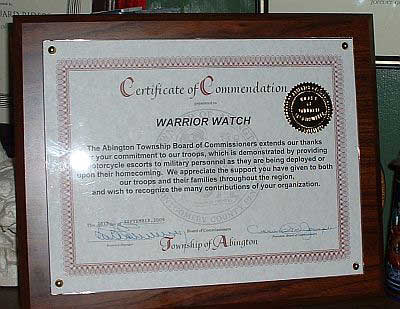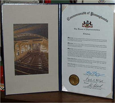 Unfortunately our luck did not hold out. Around 6:15 PM the rain started and the show cars started to flee for their heated garages. With the threat of a heavy storm approaching, Susan Hunt, the organizer, ordered us home for our own safety. The Ceremony at Dusk, which was to be our main event, was moved indoors. Around 9:00 PM that night, I got a call from Susan. She informed me that at the ceremony we were presented two Commendations for our work, one from the State and one from Abington Township! Luckily Country Mike was there to accept them for the WWR.