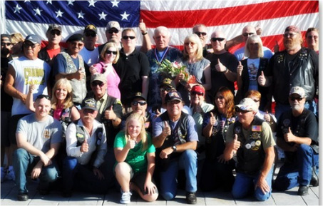 Chris Miller is the founder of Pleasanton Militay Families,a support group that is based in Pleasanton Ca. PMF ( for short ) As well as be a Vietnam Veteran,chris and the PMF team ( Pat & Sherry) and many more give tremendous support to the military families in the area.As well as outside their community.This was a hard mission to keep a secret.Since chris is very resourceful.We staged at the local gas station almost 20 bikes and 4 cages.We were to pick up Chris at his house and take him to a welcome Home & Bar-b-Que.Chris is like family to most of us,so this
