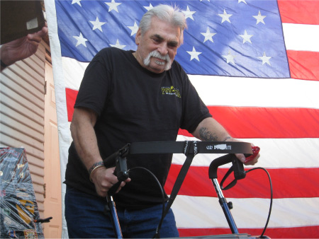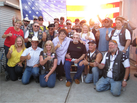 Now some Vets did so-so,and some not.well,Larry arriving home in San Francisco was not a good one,the Cab Driver refused to give him aride ,because he had his Uniform on.Now Larry,a very Highly decorated vet,has lived with that all this time ,until today.We staged , and it was hot.Counted 27 bikes,5 cages we rolled up to the restuarant where he was at with his family,Tim went in,made a announcement to the entire customer base at the restuarant,They stood and clapped for Larry.he came out to some 35-40 patriots Hand Saluting him.We Mugged & hugged him. Now he recently had surgery for his back,in Surgery they found sharpnal, from Vietnam still in him.