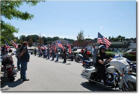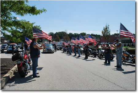 First it was 0800 hrs at Ft Dix New Jersey. Then, 1000hrs on the fly from New jersey to Penna. Then, it was 1100 hrs in Penna. then, 1130hrs. One thing for sure is WWR was Escorting this soldier home. That we did. We were all rallied in a shopping center parking lot waiting for Eric, as his wife was picking him up and taking him to us. For a Tuesday morning/afternoon it was a beautiful day with great showing of support. 15-20? I didn’t count. At 2100hrs we got notification that they were close from Erics sister in-law Jen, who was with us the whole time. Erics’ sister is an EMT with the Haverford Fire Dept. They picked up Eric along with Haverford Police Dept a mile down the road and escorted him to us. We heard the sirens and quickly formed a two row flagline for them to drive through. That they did. Eric got out of the van and was Welcomed Home by family that were there,,then we got to him with our MUG & HUG. I asked Haverford PD if they were escorting us to the house. The officer said no, as they were already out of their district. He made a call and the next thing I know is they are gonna escort us. NICE.