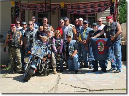 We arrived at the Spragues’ residence. The street was decorated for this occasion. Also, Erics wish was to see a bike in front of his house when he got home. That is exactly what was in front of his house. Shiney chrome ready to ride. We Mugged & Hugged Eric one more time. I presented Eric with our Magic Coin and informational folder of what our coins meaning is. A group pic and off we went. Ya gotta love twists & turns in a Welcome Home.