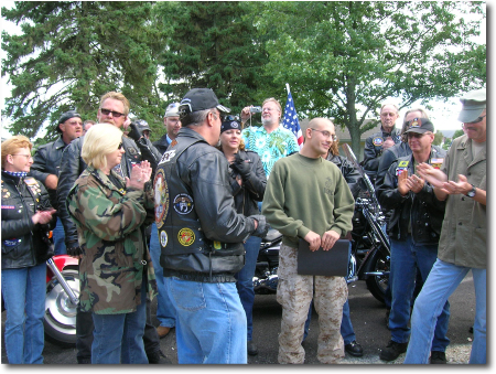 We had many people from many groups gathered together for one reason, to welcome home LCpl Arthur Wold, USMC. It was an unusually cool August evening, but we all came together to surprise this Marine, and surprise him we did. We are good at crashing family parties, especially when only the parents know we are coming.