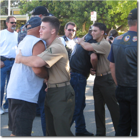 We had just left the 3 Marines Welcome Home at 1500 hrs. We jetted across town,so we could grab some chow. Joann called me and said she would leave the house at 1630 Hrs.Her other son Cpl. Aaron Mcrea will be deploying mid Sept. So,the familywas headed over to a park to take some photos,for the scrapbook.Now,Travis & Aaron were in uniform for this. And at the park little did they know the house was being invaded by Bryan ( Lafayette Flag Brigade) and Sherry(aka Snapshot) and others. They tore down their equipment and banners from the 3 Marine and re-setup at the Mcrae’s home.So at 1725 Hrs. we headed over to the park with 13 bikes and a Flag Truck (diane).we pulled in and parked Aaron knew what was happening,but not Travis.We brought Aaron home last year,so he knows the flag bikes.We met the Marines and hugged them and chatted.Mom could not stop smiling,well I had to stall for 15 mins.