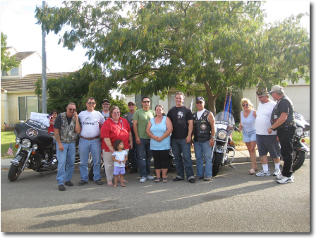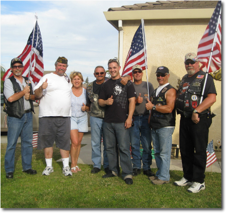 We met at the Quik-stop,Sun was beating down on us. Cpl. McDaniel and his uncle(jim) were on the road from Pendleton since 1030 hrs..As we waited,one of the local FD engines saw us and pulled in.They were wondering if we had someone coming home. I told them the intel,so they waited with us.About 15 mins. later Jim pulled his pickup into the stop.Cpl. McDaniel got out and we gave him alot of hugs and well wishes.He was totally surprised that we were there for him.So,we put 2 flag bikes up front and 2 flag bikes behind him and headed to the house.