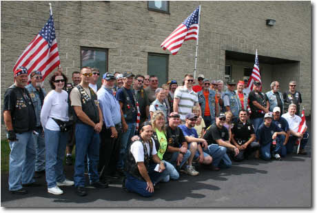 Our state coordinator Grease & myself gave our ride briefing as to what to expect at our arrival at Martin Motor sports, plan was to leave the mall at 11:30, arrive at Martin’s before 12 & that we did. Our RG (road guide) Grease led us safely to our destination, upon arrival we were greeted by the Liberty Fire Company and the Valley Forge Chapter of the Star Motorcycle Club so we did some quick PR work & took our places & formed our flag line across the front of the building & awaited the arrival of our package, & arrive he did, promptly at 12 to the sights & sounds of a flag draped fire truck & police car at the entrance, Adam must have thought the place was on fire, but the only fire burning was in our hearts, burning with pride for the son of one of our members