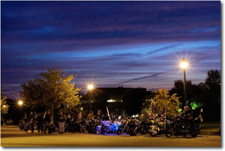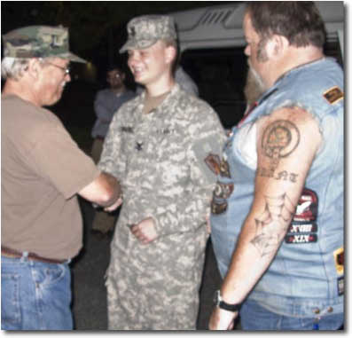 Nineteen bikes and 2 cages, a total of about 24 people showed up at the Painters Crossing shopping center near Chadds Ford Pa. to await our hero’s arrival. As the Miller family pulled into the theatres’ parking lot, Kyle wanted to know why they were going to the theatre. It didn’t take long until he found out. WWR was lined up smartly, came to attention and rendered a salute as they approached. Kyle came out of the van to the applause and cheering of a WWR welcome home. After 15 minutes of back slapping and hugs, we mounted up and headed for the Miller home. Kyle decided to ride with Grease for the remainder of the trip. Grease forgot to leather up and got to ride the 21 miles to the Miller home in 55 degree weather with just a vest on. Chilly big fella?