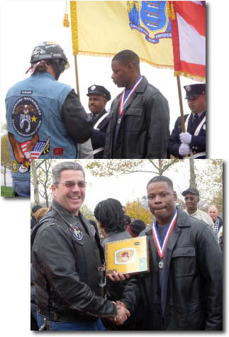The city of Camden pulled out all the stops for their hometown hero. The FD had a ladder truck with a 40 foot American flag unfurled, a Color Guard was there, the Philadelphia FD had their fire boat shooting water high into the air. Camden Mayor, Gwendolyn Faison, presented a proclamation. Colonel Benton, USMC retired, presented a medal. WWR’s Cavalier presented an Honor coin to Jermaine while I presented one to Danotta, his wife, and the Yellow Ribbon Club presented a special blanket and large yellow ribbon.