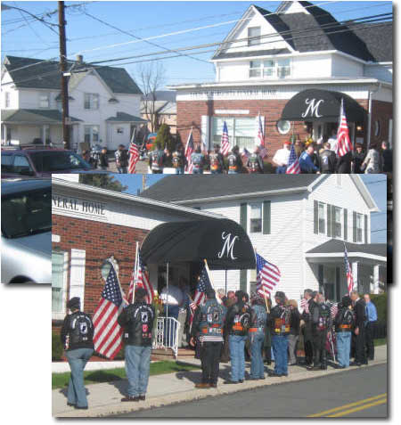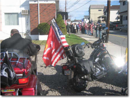 Monday morning the weather was not conducive to a motorcycle escort, but we stood again in honor. After a service at the Louis Margotta Funeral Home, Jessup, PA, the funeral processed to the Sacred Heart Of Jesus Church, Peckville PA. After the Mass at the church, military honors, including pipes and bugle, were given by the U.S. Marine Corps.