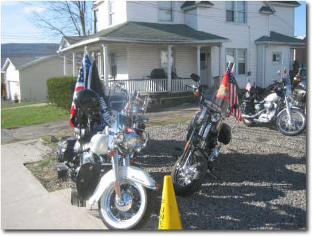 On Sunday Evening, fifteen members of Warriors’ Watch Riders and Friends of the Forgotten Northeast Wing formed a flag line at the entrance of the Funeral Home. At one point in the visitation, we momentarily broke our flag line to pay our own respects. Staff Sergeant Al Gibbs, USMC, Commandant of the Marine Corps League Northeast Detachment in Scranton PA, stood as our members passed with the Colors, and followed with a final salute to the departed Hero. Cpl. Steppacher’ daughter, Sgt. Mary “Kate”‘ Steppacher, USMC, was most gracious in expressing her gratitude for our support, however we all know that it is always our honor to stand for an American Hero on his final mission.