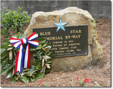 The Blue Star By-Way Marker symbolizes the Blue Star flags, which were hung in the windows of families of service members during World War II. After the war, the Federated Garden Clubs began erecting memorials and soon came to honor all service members.